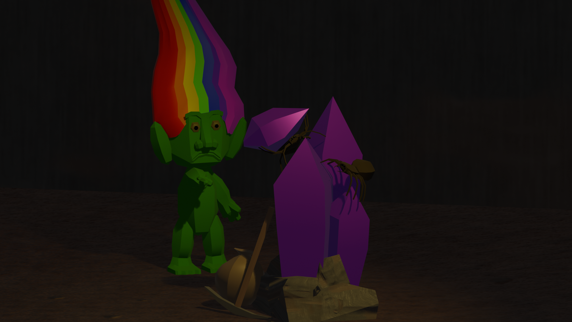 Join this goblin on a journey of self-discovery, spiritual growth and shooing spiders with a torch. Accompanied by their trusty pickaxe, heavy sack, and glorious rainbow hair.